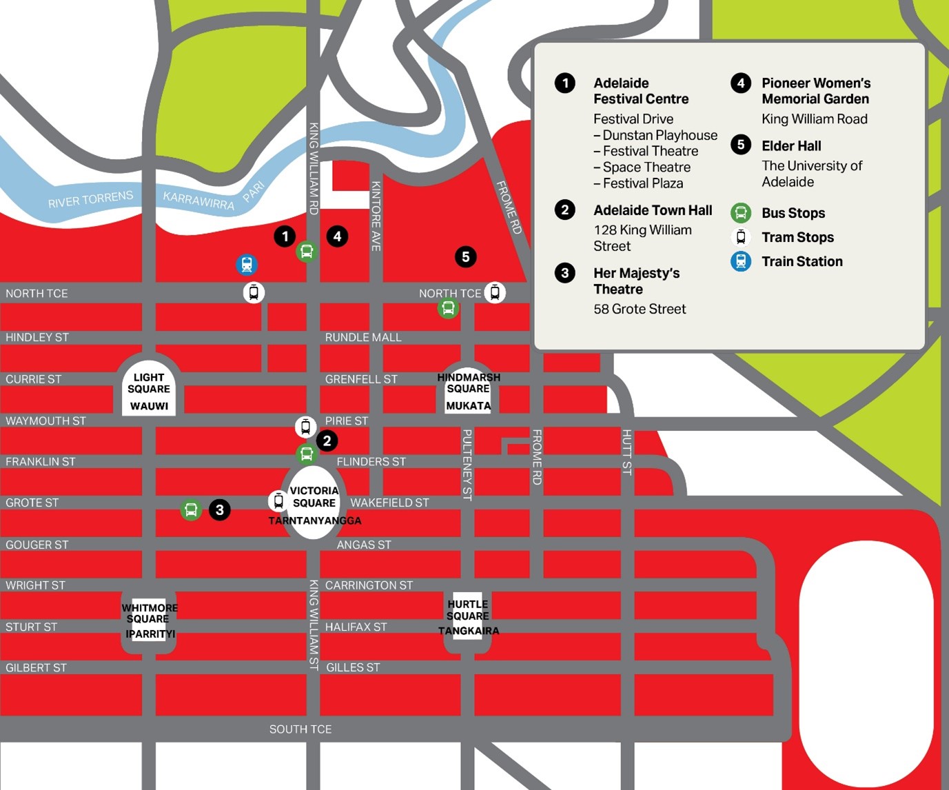 There are a number of venues home to Adelaide Festival events. Please see information below for our key venues, and head to our Venues page to view transport and access information for all venues. South Australian Seniors Card members can travel for free on all Adelaide Metro buses, trains and trams – all day, every day! Some of the most direct public transport options are listed below: