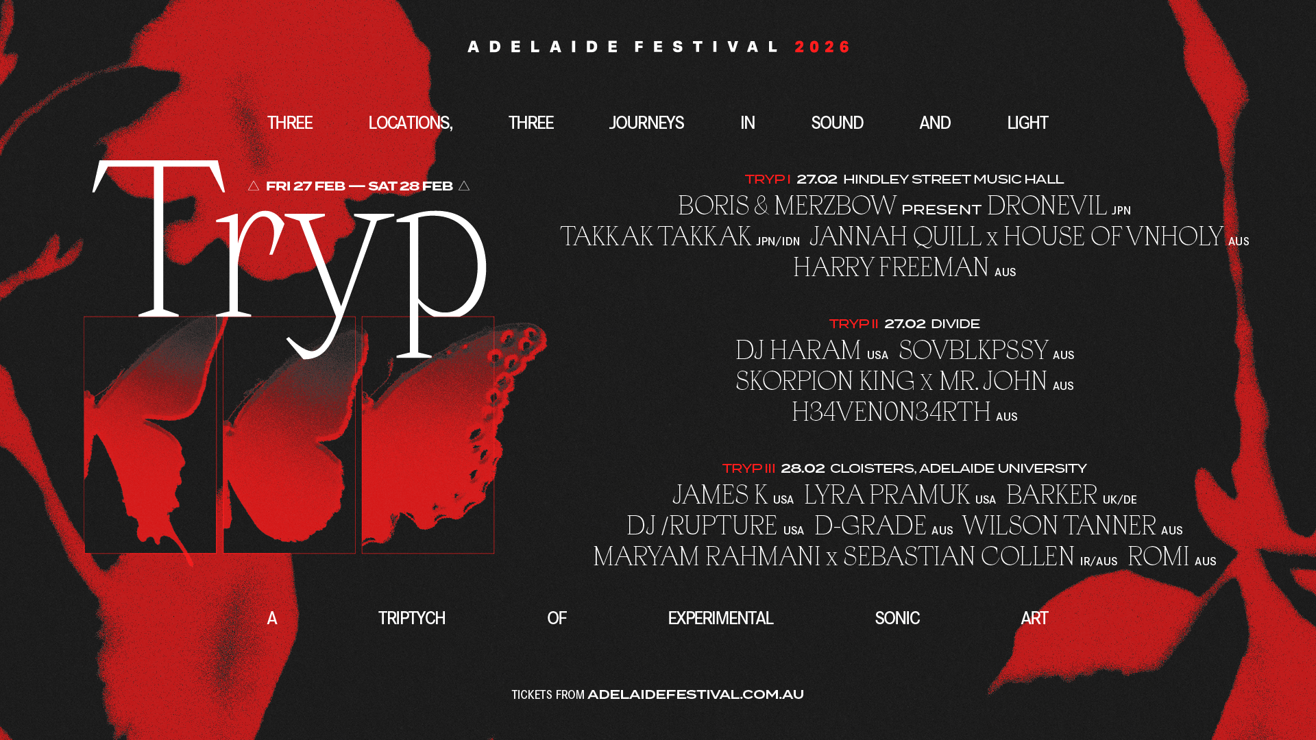 Enter the broad church of progressive, contemporary music across the opening weekend of Adelaide Festival 2026. Three movements in sound present a scared triptych of noise and light, invocation and communion, reflection and ecstatic release. Join us for Australian exclusives, exciting audio-visual collaborations and the best local and global voices in experimental sonic art, club and electronica.